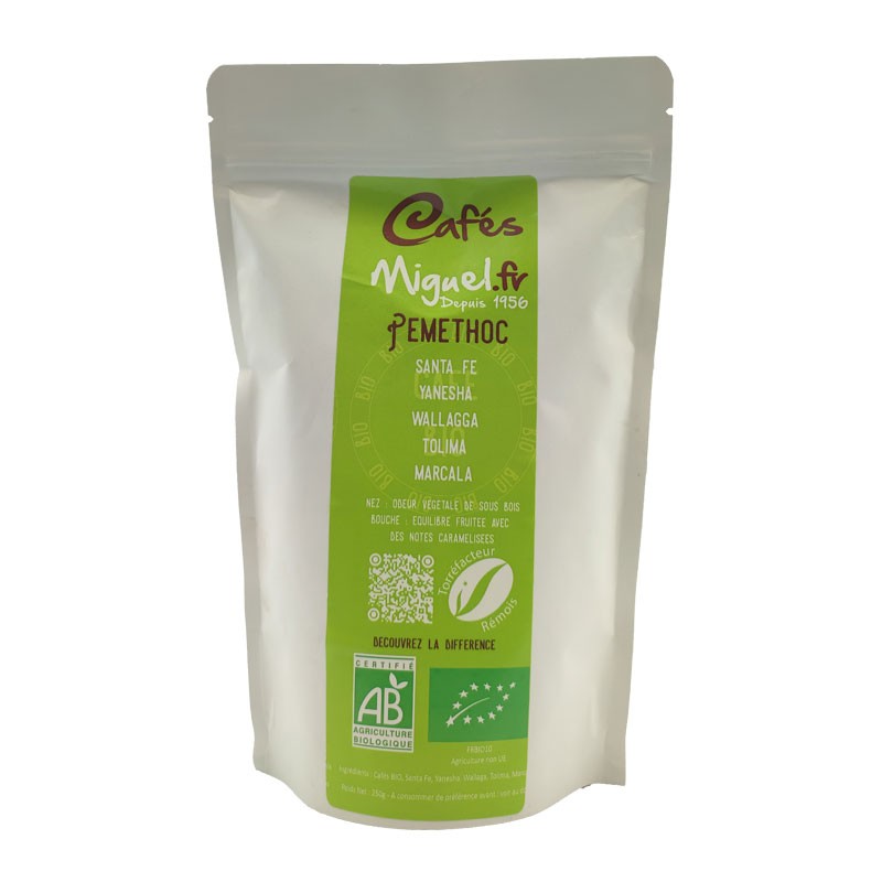Le Pemethoc est un café BIO très spécial. C’est un assemblage 100% arabica où sont utilisés (dans un mélange très étudié) plusieurs cafés d’origines très différentes : la base vient d’Ethiopie qui donnera toute la consistance au café.