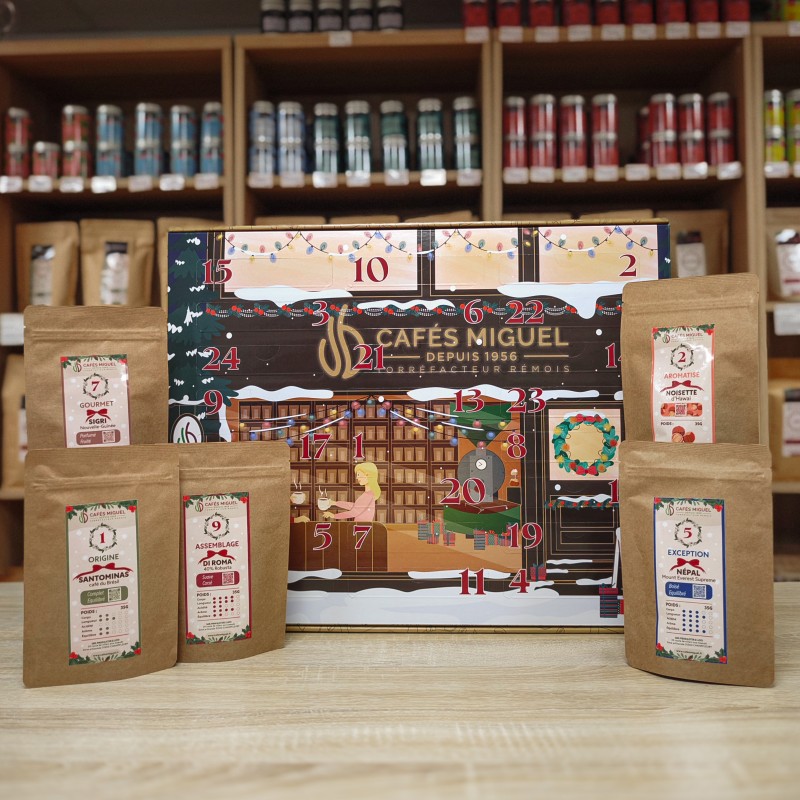 Découvrez le calendrier de l’Avent Cafés Miguel avec son visuel rappelant notre boutique du centre-ville de Reims, une invitation à la dégustation avec 24 sachets de 35 g de cafés en grain ou moulu : crus d’origine, assemblages, cafés de spécialité, aromatisés et crus d’exception.