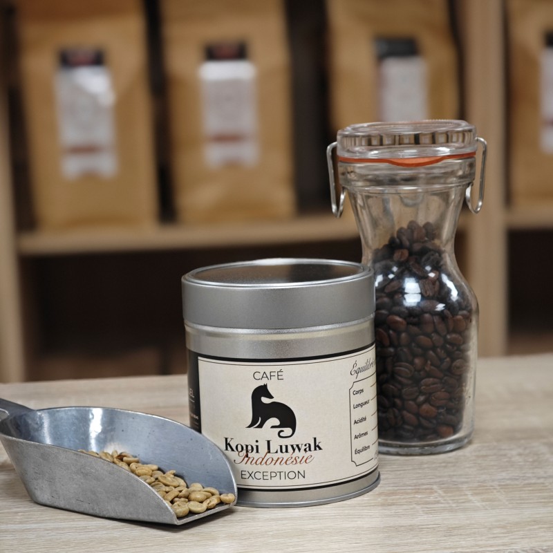 Découvrez les grains de café Kopi Luwak d'Indonésie, disponibles en boîte de 125 g.