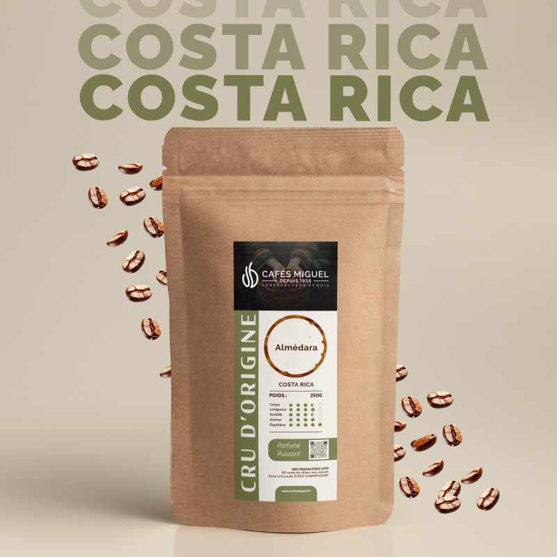 Découvrez notre Almedara en grain du Costa Rica, torréfié avec soin dans notre atelier, pour vous offrir un café d'origine.