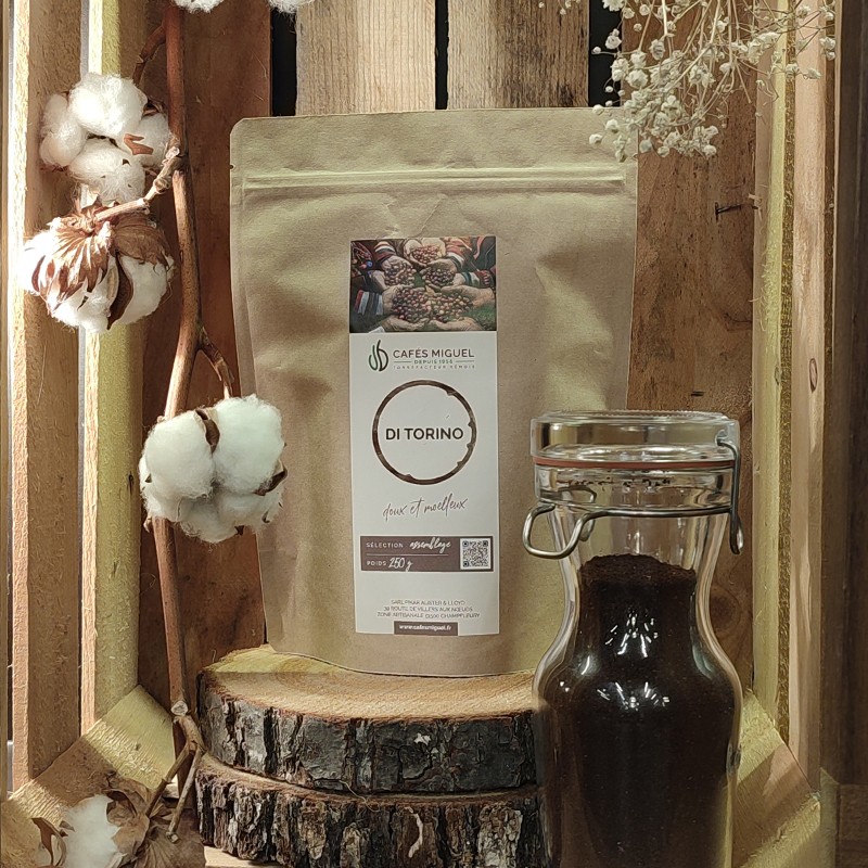 Découvrez notre assemblage "fait maison" : le Di Torino, un mélange harmonieux de deux cafés de qualité, l'un originaire du Brésil et l'autre du Honduras.
