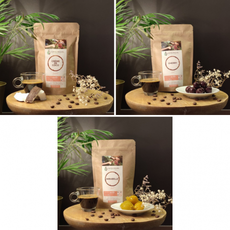 Explorez un univers de saveurs exquises avec notre lot de Café Aromatisé "Fruitée". Plongez dans la douceur tropicale avec le Café Crème de Coco, savourez l'explosion de fruits rouges avec le Café Cherry, et laissez vous séduire par la délicate douceur de la mirabelle avec le Café Mirabelle.