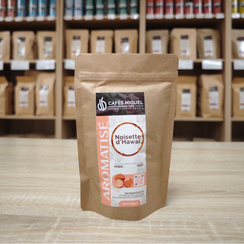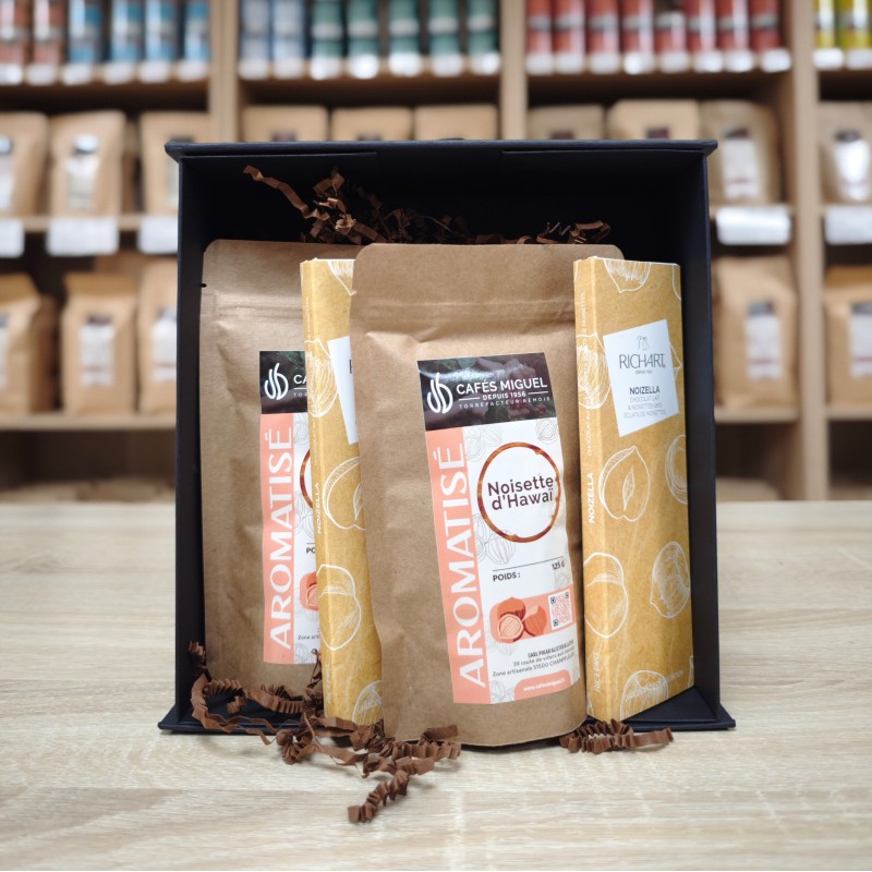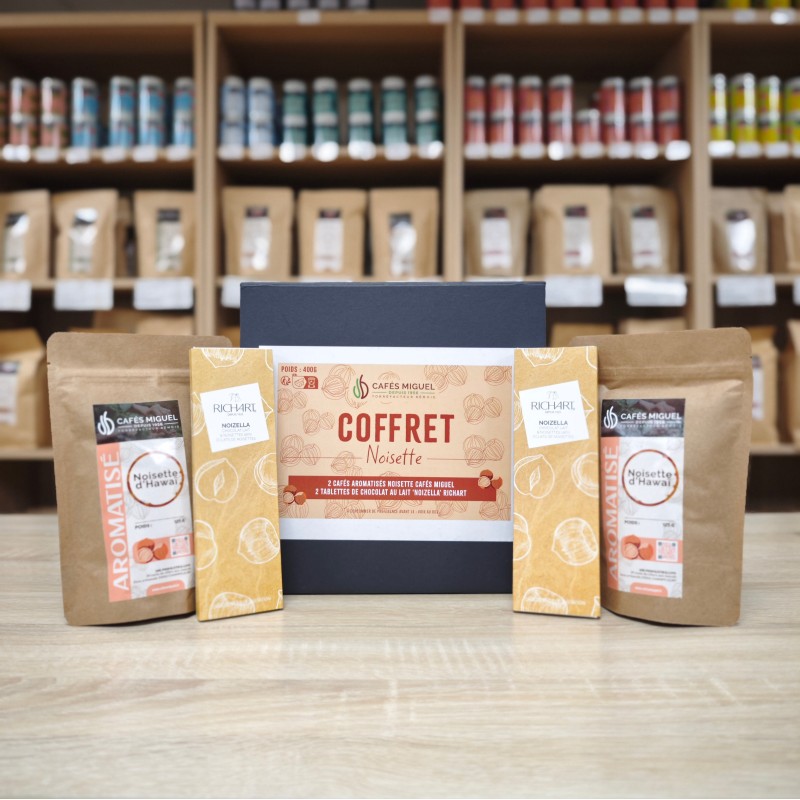 Il réunit 2 sachets de 125g de café aromatisé à la noisette Cafés Miguel et 2 étuis de mini-tablettes Richart au lait aux éclats de noisettes.