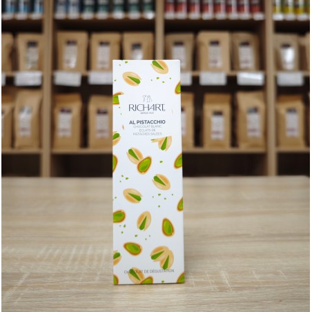 Accompagnés de 2 étuis de mini-tablettes Richart, soit 8 carrés de chocolat blanc aux éclats de pistaches salées.